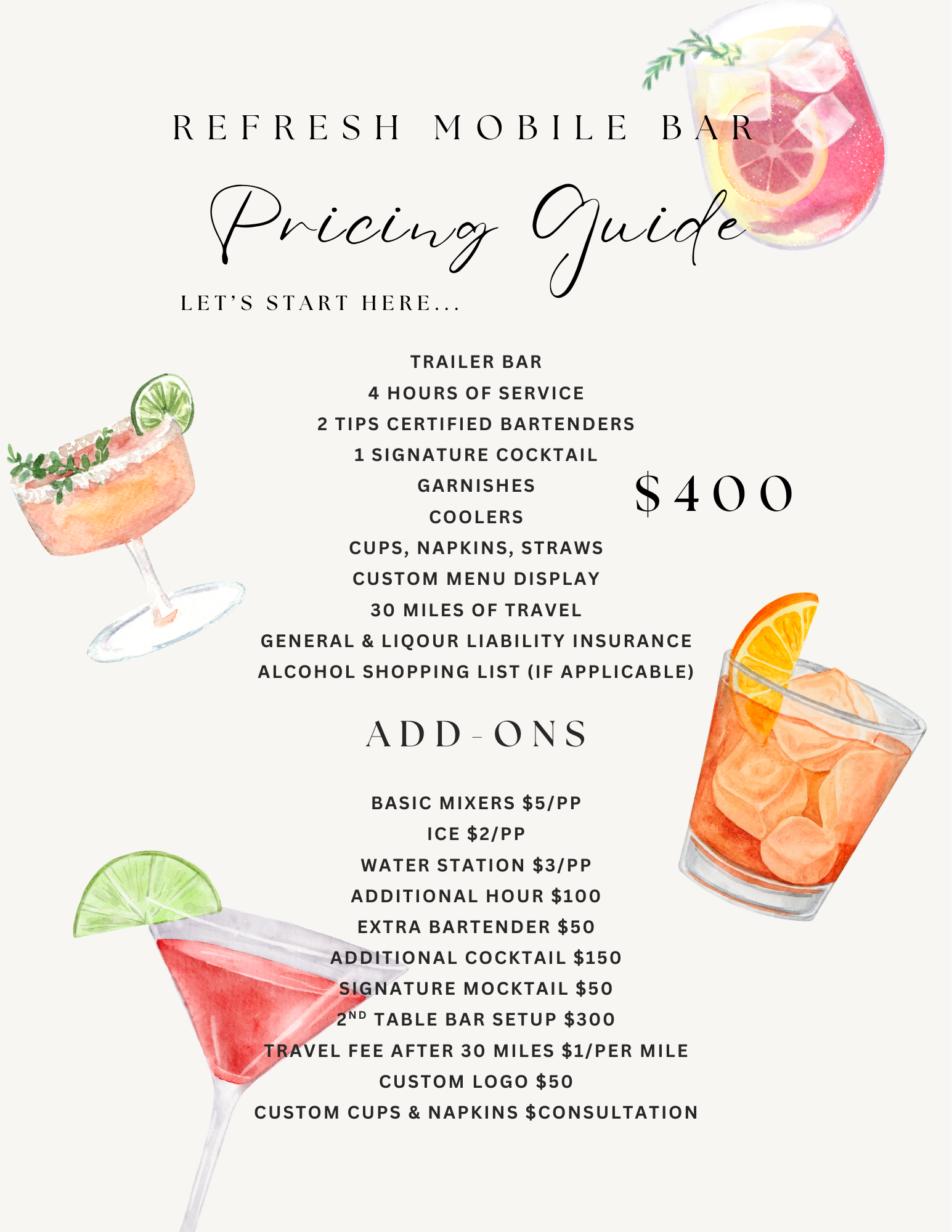 Please remember, we are a dry hire bartending service. Meaning you buy the alcohol from a suggested list we provide, and we take care of everything else.